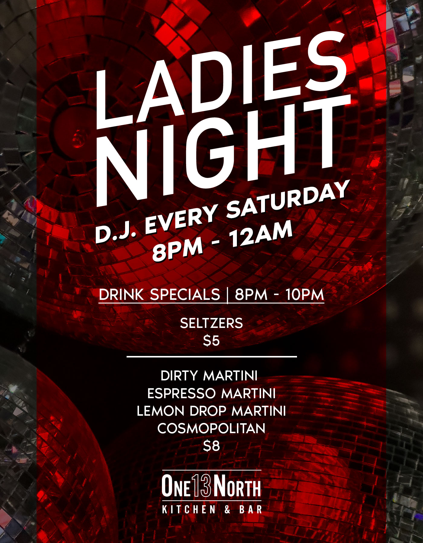 One13North 113 N. Main St, Crown Point, IN, United StatesLadies Night every Saturday with DJ from 8pm to 12am. Drink specials from 8pm-10pm